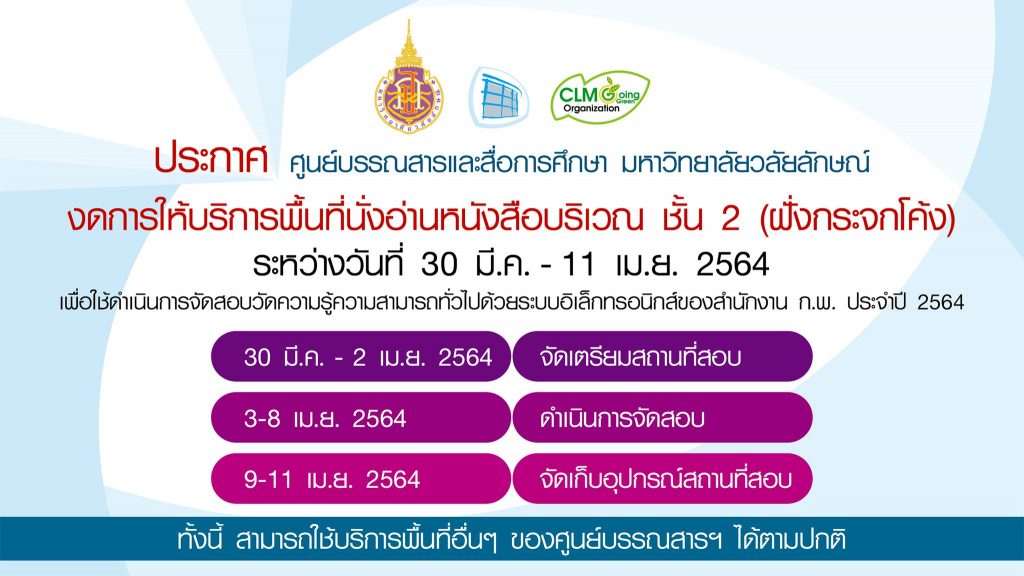 งดบริการพื้นที่นั่งอ่าน ชั้น 2 เพื่อสอบเพื่อวัดความรู้ความสามารถทั่วไป (ก.พ.) ด้วยระบบ อิเล็กทรอนิกส์ ประจำปี 2564 (e-Exam)