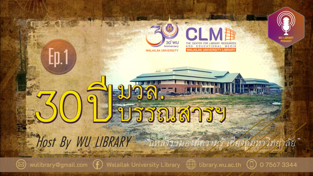 WU Library Podcast : Ep.1 30 ปี มวล. 30 ปี บรรณสารฯ https://youtu.be/7PrP-TfrtgQ เนื่องในโอกาสมหาวิทยาลัยวลัยลักษณ์ครบรอบการก่อตั้ง 30 ปี ในปี พ.ศ. 2565 ซึ่งถือได้ว่าเป็นมหาวิทยาลัยน้องใหม่ที่กำลังมีพัฒนาก้าวตามมหาวิทยาลัยรุ่นพี่อย่างกระชันชิด ด้วยความพร้อมในด้านต่างๆ ทั้งกายภาพ บุคลากรที่มีคุณภาพและคณะผู้บริหารที่มีความมุ่งมั่นในการพัฒนาทุกด้าน ส่งผลให้มหาวิทยาลัยวลัยลักษณ์มีผลงานสู่สังคมและมีพัฒนาการแบบก้าวกระโดดในระดับโลกอย่างเห็นได้ชัดเจน ศูนย์บรรณสารและสื่อการศึกษาในฐานะหน่วยงานสนับสนุนการเรียนการสอน ซึ่งเปิดให้บริการตั้งแต่ปี 2541 เคียงคู่กับการดำเนินงานของมหาวิทยาลัย วันนี้ ขอเล่าถึงประวัติความเป็นมาพัฒนาการและของศูนย์บรรณสารและสื่อการศึกษา มหาวิทยาลัยวลัยลักษณ์ให้ทุกท่านได้รู้จักมากยิ่งขึ้น
