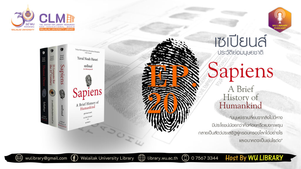 Leave a Comment / Podcast / By rpreecha WU Library Podcast Ep. 20 : เซเปียนส์ ประวัติย่อมนุษยชาติ เซเปียนส์ หนังสือประวัติศาสตร์ของมนุษย์ที่ตั้งต้นด้วยคำถามที่ว่า “มนุษย์เราเปลี่ยนจากลิงไม่มีหาง มีประโยชน์น้อยกว่าหิ่งห้อยหรือแมงกะพรุน กลายเป็นสัตว์ประเสริฐผู้ครอบครองโลกได้อย่างไร และอนาคตจะเป็นเช่นไรต่อ” จากอดีตอันไกลโพ้น มีสิ่งมีชีวิตอย่างมนุษย์มากมายหลายสปีชี่ อาทิ นีแอนเดอร์ธัลเลนซิส อีเร็กตัส โซโลเอนซิส ฯลฯ ในเวลานั้นเซเปียนส์ก็ไม่ได้เก่งกาจเหนือสปีชี่อื่นๆ แต่ “การปฏิวัติการรับรู้” ที่เกิดขึ้นเมื่อ 70,000 ปีก่อน Post Views: 195