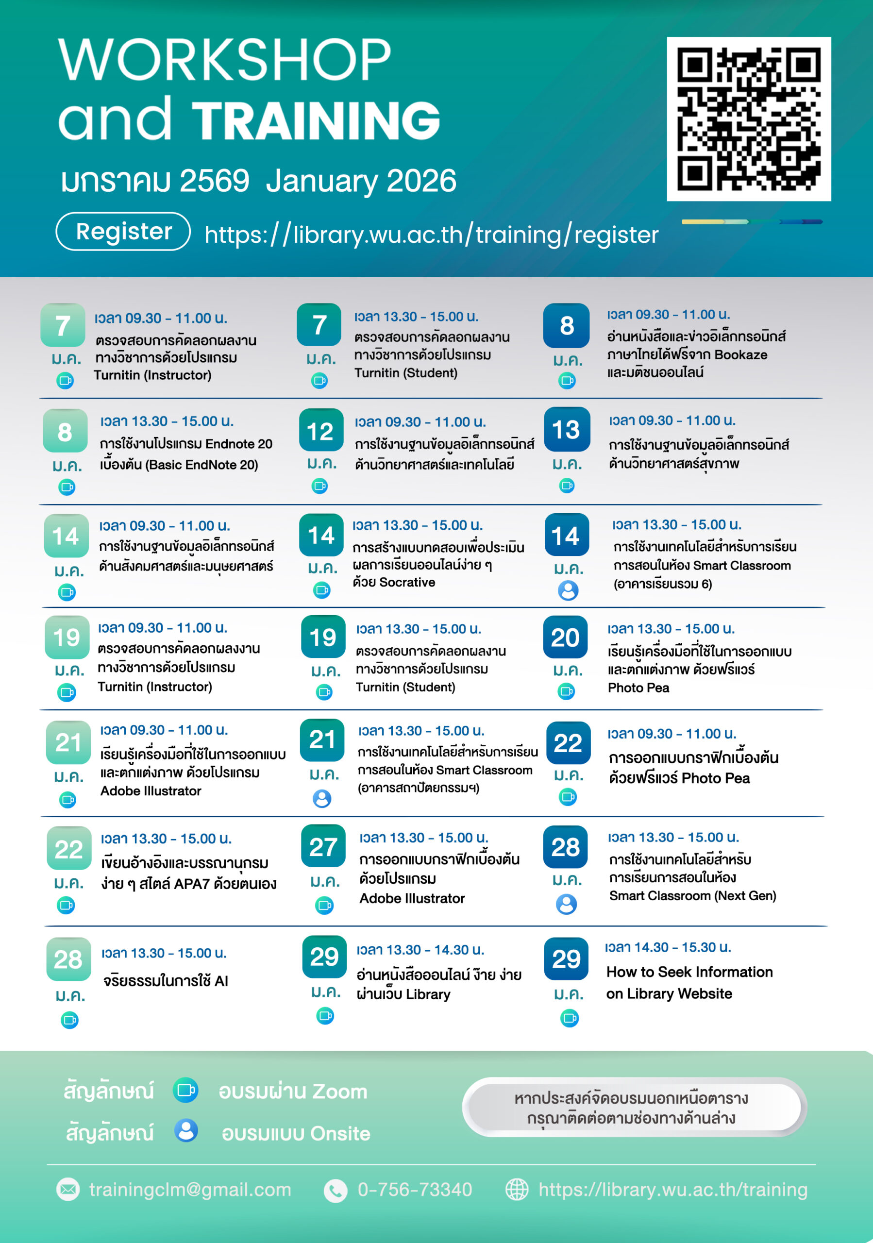 หลักสูตรการจัดอบรมของปี 2569  จะมีการปรับปรุงหลักสูตรใหม่ แต่จะเริ่มปรับปรุงในเดือนกุมภาพันธ์ 2569 ขอให้รอการจัดอบรมกับศูนย์บรรณสารและสื่อการศึกษานะคะ  สำหรับเดือนมกราคมนี้ ยังจัดการอบรมเหมือนเดิมกับหลักสูตรที่มีอยู่ดังปฏิทินอบรมด้านล่าง และหากต้องการอบรม คลิก เพื่อลงทะเบียนได้เลย หลักสูตรการจัดอบรม BOOKAZE Health Science Science & Tech. HUM & SSC. Smart Classroom (AD) Smart Classroom (ST) Smart Classroom (Next Gen) SOCRATIVE Turnitin (Instructor) Turnitin (Student) Smart Classroom (ST) APA7 AI Ethics Seek Information eBook Online AI Ethics Adobe Illustrator Adobe Illustrator PhotoPea PhotoPea