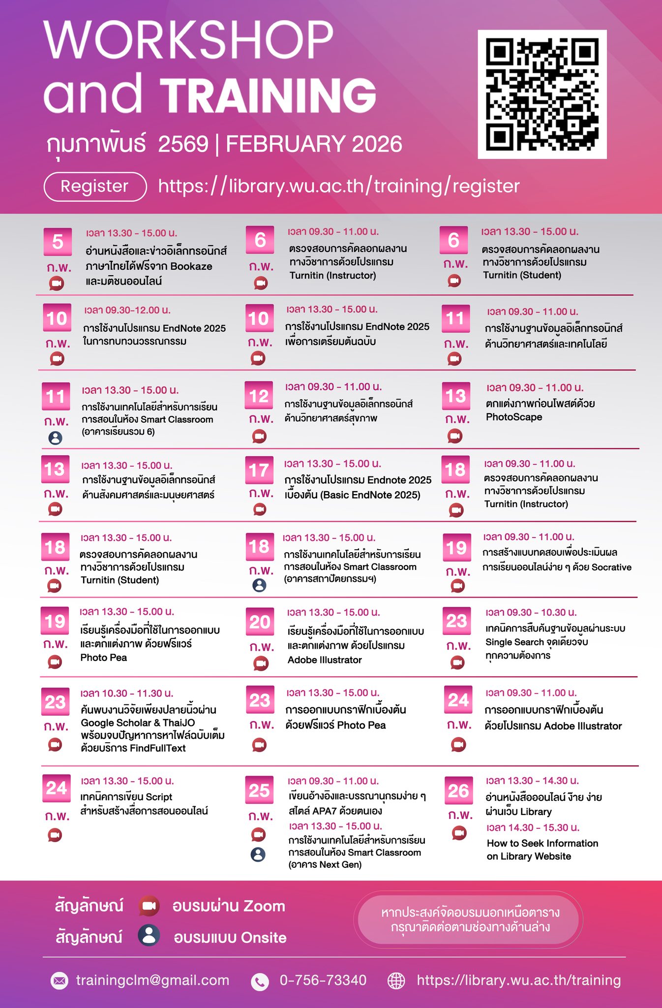 เดือนธันวาคม  2568 เดือนสุดท้ายของปี 2568 ศูนย์บรรณสารและสื่อการศีกษา ยังคงจัดการอบรมต่อเนื่อง เป็นเดือนที่เปิดภาคการศึกษาที่ 2 ของนักศึกษาของมหาวิทยาลัยวลัยลักษณ์  เราจัดหลักสูตรการอบรมที่มีการจัดอย่างต่อเนื่อง ไดัแก่   การใช้งานเทคโนโลยีในห้อง Smart Classroom อาคารเรียนรวม 6 การใช้งานเทคโนโลยีในห้อง Smart Classroom อาคารสถาปัตยกรรมและการออกแบบ การใช้งานเทคโนโลยีในห้อง Smart Classroom อาคาร Next Gen  การตรวจสอบการคัดลอกผลงานทางวิชาการด้วยโปรแกรม Turnitin (Turnitin for Instructor) การตรวจสอบการคัดลอกผลงานทางวิชาการด้วยโปรแกรม Turnitin (Turnitin for Student) การใช้งานฐานข้อมฺลอิเล็กทรอนิกส์ด้านสังคมศาสตร์และมนุษยศาสตร์ การใช้งานฐานข้อมฺลอิเล็กทรอนิกส์ด้านวิทยาศาสตร์และเทคโนโลยี การใช้งานฐานข้อมฺลอิเล็กทรอนิกส์ด้านวิทยาศาสตร์สุขภาพ   การเขียนอ้างอิงและบรรณานุกรมง่าย ๆ สไตล์ APA 7   จริยธรรมในการใช้ AI โปรแกรมในการออกแบบ เช่น PhotoPea Adobe Illustrator ท่านใดสนใจลงทะเบียนได้เลย … Read more