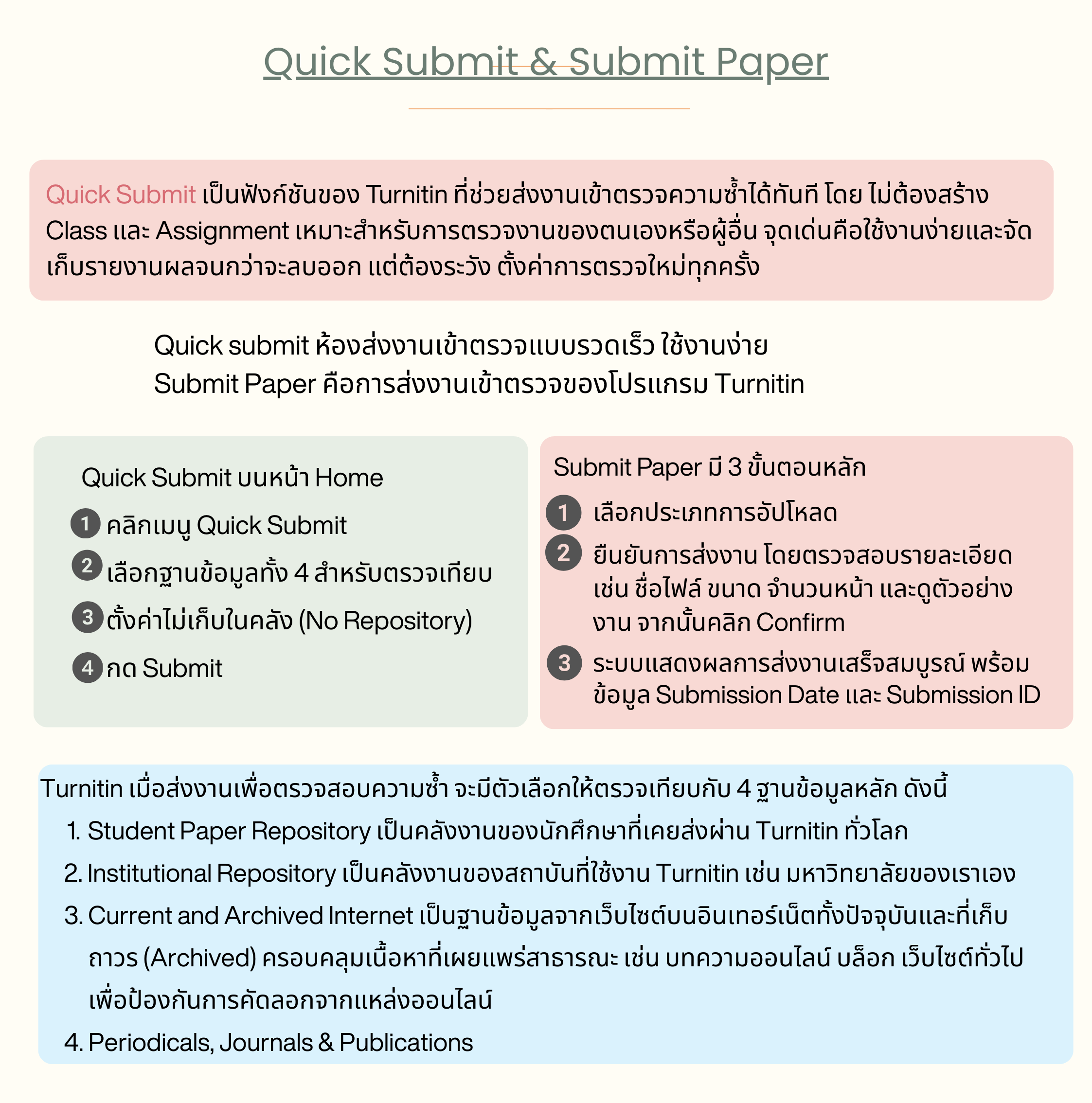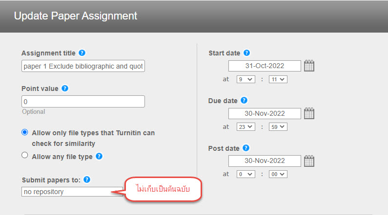 แต่มีจุดที่ควรระวัง คือจะต้องตั้งค่าการตรวจ ใหม่ทุกครั้งที่ส่งงานแบบ Quick Submit และที่สำคัญการตั้งค่า submit paper to = no repository ทุกครั้งเท่านั้นจึงจะปลอดภัย