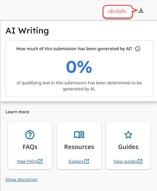 รายงานการตรวจระบุว่าข้อความส่วนใดบ้างที่สร้างขึ้นโดย AI และประโยคเหล่านั้นจะถูกเน้นด้วยสีน้ำเงินให้ทราบว่าส่วนใดบ้างที่อาจจะเขียนโดย AI มีเฉพาะ Instructor เท่านั้นที่จะเห็นรายงานผลการตรวจ AI Writing