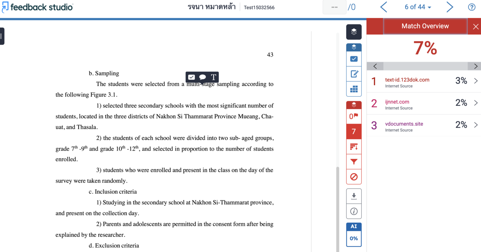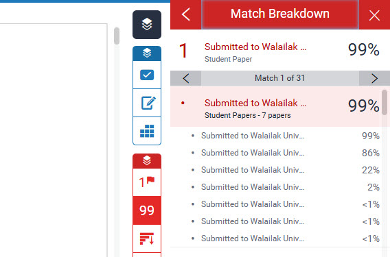ฟังก์ชั่นการรายงานผลการตรวจการคัดลอกของต้นฉบับที่ส่งตรวจกับฐานข้อมูลโปรแกรม Turnitin นั้น จะแสดงผลหลังจากการตรวจเสร็จสิ้นลง ผู้ใช้จะได้รับผลการตรวจ ที่มีรายละเอียดการชี้แหล่งข้อมูลที่ซ้ำ แสดงรายการซ้ำแยกไฮไลท์เป็นแถบสีที่แตกต่างกัน โดยเรียงลำดับตามเปอร์เซ็นต์ความซ้ำจากมากไปหาน้อย